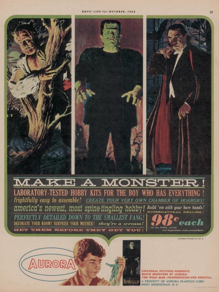 This paper offers a brief history of the monster model-kits produced in the 1960s and 1970s by the styrene-plastic assembly-kit company Aurora. Based on popular horror-film characters, preeminently the monsters of Universal Pictures, such as the Frankenstein Monster, Dracula, and The Wolf Man, these collectibles were aimed at a postwar generation of adolescent “monster kids.” In conjunction with popular magazines such as Famous Monsters of Filmland and “hosted horror” programs broadcast on late-night television, this new market created the conditions for the modern horror fan culture we recognize today